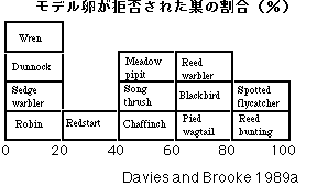パラサイトの卵を認識して排除すれば、托卵の被害を回避できるのですが、すべてのホスト個体が怪しい卵を認識して排除してはいないのです。Davies and Brooke(1989a)は、カッコウに托卵されるホストの卵認識能力を調査しました(下図)。卵を排除する個体の割合はホスト集団ごとに異なっていますが、だいたい、0〜100%まで、連続的に分布することがわかりました。